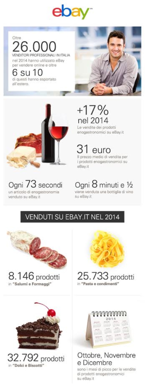 Una crescita del +17% nel 2014, con un valore medio d’acquisto pari a 31 euro: le categorie relative ai prodotti enogastronomici su eBay.it. E per il 2015 si prospetta un’ulteriore crescita, un segnale di come l’ecommerce si stia sempre più affermando tra i canali preferenziali per vendere online anche prodotti enogastronomici e del Made in Italy.