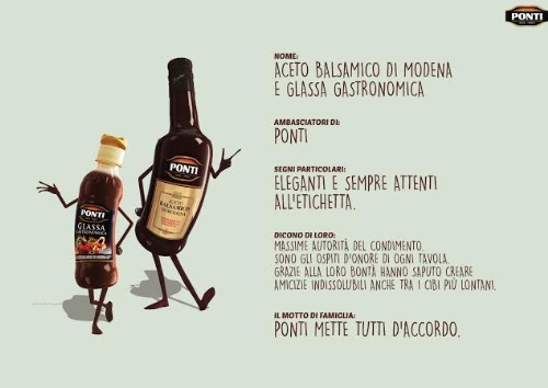 Ogni personaggio incarna una specifica tendenza alimentare e, per questo, mostra ostilità o diffidenza nei confronti degli altri. Dopo una iniziale caratterizzazione dei personaggi e delle loro fazioni, la campagna mostra gli scontri tra queste, che si svolgono, ironicamente, a colpi di forchette, bacchette, braci roventi e arti marziali. Alla fine, il ruolo di paciere spetta sempre a Ponti, che sa come far andare d’accordo tutti. Con Aceto e Glassa Gastronomica all’Aceto Balsamico di Modena IGP, Ponti riporta la pace e l’armonia e propone tante ricette create appositamente per abbracciare cucine diverse, rispettando sempre ogni filosofia culinaria. Così, in modo semplice, Ponti dimostra che in cucina l’amore vince sempre.