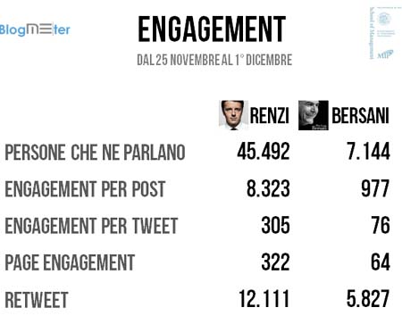 Anche i tassi di engagement registrati sono stati al rialzo per entrambi i contendenti, ma Renzi ha staccato nettamente il segretario del suo partito. Su Facebook Renzi ha raccolto 490.722 reazioni tra like, share, commenti, post spontanei. Ogni 1000 fan ha generato 322 azioni e ogni post scritto ha ottenuto 8.323 interazioni. Bersani invece ha ottenuto 37.899 reazioni, ogni suo fan ha generato 64 azione e ogni post scritto 977 interazioni.