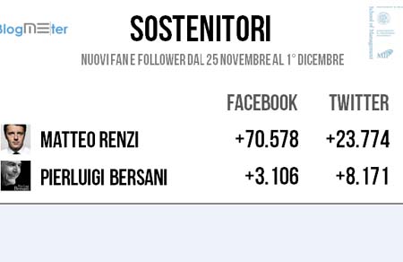 Dalla sintesi del dettagliato lavoro di osservazione dei social media svolto nell’ultima settimana da Blogmeter e Politecnico di Milano sulle primarie del Centro-Sinistra e in particolare sul confronto tra i due candidati Matteo Renzi e Pierluigi Bersani, spicca la performance del 'Rottamatore' che nell’ultima settimana guadagna più fan su Facebook e Twitter e registra un migliore tasso di engagement rispetto a Bersani. Quasi 600.000 le conversazioni registrate nell’ultima settimana di sfida (25 nov-1 dic), quasi quante quelle emerse nei primi 20 giorni di novembre. Il 90% di queste proviene dai social network. Il 49% hanno riguardato Renzi, il 36% Bersani, il 10% Vendola, il 3% Tabacci e il 2% Puppato. Restringendo il campo solo ai due competitor maggiori, Renzi arriva al 57%, Bersani 43%.