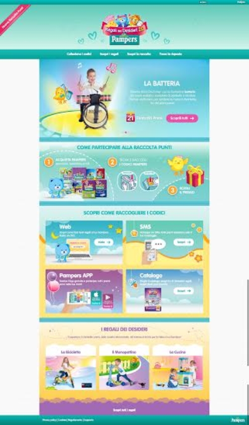 'Regali dei desideri 2.0' è la prima collection multicanale di Pampers che introduce nel progetto di fidelizzazione una componente di gamification che permette di guadagnare punti aggiuntivi con le 'Baby Mission': rispondendo a sondaggi online, invitando amici a partecipare alla raccolta, condividendo sui social un contenuto, partecipando ai giochi o diventando Ambasciatrice Pampers, è infatti possibile ricevere ulteriori punti omaggio.