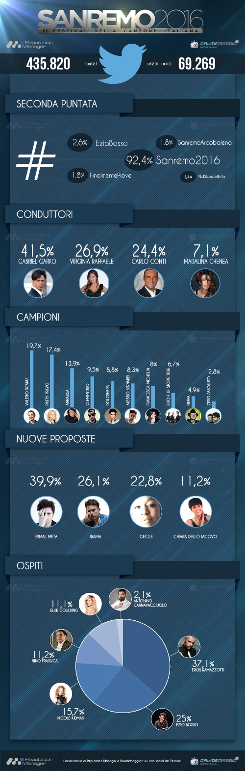Su Twitter in questa seconda serata l’hashtag ufficiale #Sanremo2016 è stato utilizzato nel 92,4% dei tweet, al secondo posto il più twittato è stato l’hashtag #EzioBosso dedicato al musicista che ieri ha emozionato tutta la platea dell’Ariston con le sue parole e le sue note.