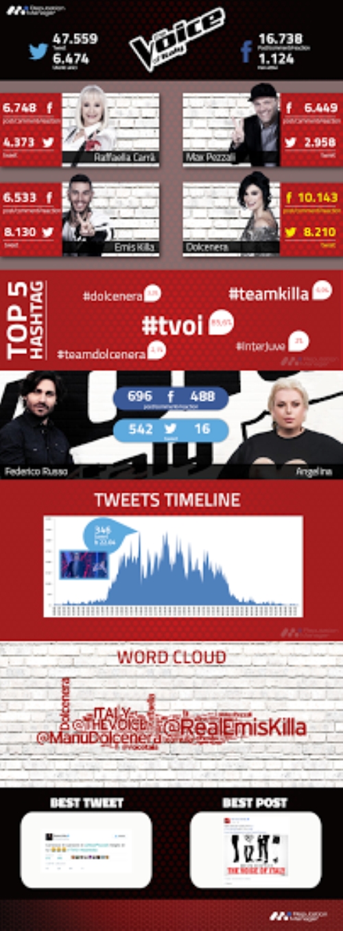 La seconda puntata di 'The Voice of Italy' su Rai 2 ha ricevuto 47.559 tweet inviati da 6.474 utenti unici, registrando un calo di interazione del 28% rispetto alla prima puntata, mentre sulla Fan Page ufficiale di Facebook i fan hanno interagito con 2.242 post/commenti pubblicati da 1,124 utenti unici e 16.738 reactions.