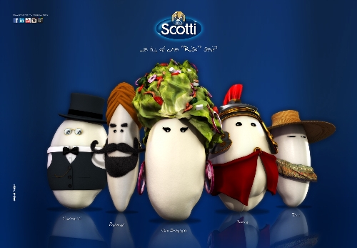 Nel tentativo di associare l'anima al prodotto, cioè quell’insieme di valori nei quali i consumatori si possano riconoscere, Riso Scotti ha focalizzato che la propria anima è il riso. Quale testimonial migliore, dunque, del chicco di riso per raccontarsi e raccontare? Ecco allora che ciascuna varietà di riso si anima attraverso il proprio chicco-simbolo, il quale partendo da un’immagine guida simpatica ed ammiccante trasmette immediatamente la storia e la tradizione del suo varietale e ne suggerisce l’utilizzo.