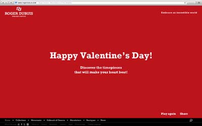 Si ispira al battito del cuore la campagna di comunicazione che Roger Dubuis lancia online sui propri mezzi: sito ufficiale, pagina Facebook, Twitter, Pinterest, Instagram e Canale Youtube. Il sito ufficiale della Maison Ginevrina, www.rogerdubuis.com, accoglierà per una settimana i visitatori con una homepage che presenta una speciale animazione dedicata alla ricorrenza e che introdurrà alle preziose collezioni di orologeria al femminile: Velvet e Excalibur 36.