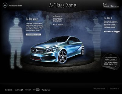 Un piano integrato, studiato per far dialogare tra loro tutti gli strumenti realizzati, quindi un sito web che non è solo il racconto delle caratteristiche dell'auto, bensì una finestra sul mondo Classe A, un mondo fatto di design, sportività e tecnologia; un mondo che vive sul nuovo sito, non come una raccolta di immagini e schede di prodotto, ma come un insieme di contenuti multimediali e informazioni sviluppate sui principali social network, da Mercedes-Benz e dagli stessi utenti e fan.