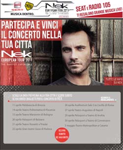 Il primo a salire sul palco è Nek, con il tour 'The Quartet Experience': per tutti i fan che vorranno partecipare al contest, online dal 9 aprile al 2 maggio, sarà sufficiente collegarsi al sito www.105.net, iscriversi alla community di 105 e selezionare una data del tour.