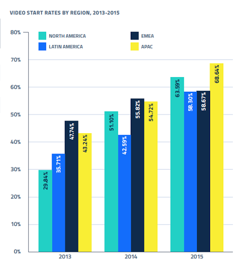 -la regione EMEA ha visto la maggior crescita dal 2013, con il 160%, il Nord America ha visto la maggior crescita nel video nel 2015 con il 52%, seguita dall’APAC a poco meno del 50%.