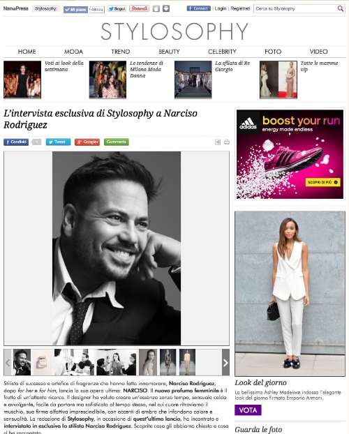 Ha scelto l’Italia e ha scelto Stylosophy.it per raccontare la ‘genesi’ di NARCISO, la sua ultima fragranza femminile. Narciso Rodriguez, stilista statunitense, di origini cubane, di fama mondiale si affida così a tg|adv e a Trilud per raccontare, in esclusiva-web nazionale, ad una platea di oltre 800 mila lettrici, la sua nuova creazione, capace di ‘parlare’ ad una donna sensuale, celebrando il mistero dell’attrazione all’insegna del lusso.