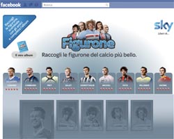 On line su Facebook da fine agosto, le 'Figurone' di Sky in pochi mesi sono diventate la prima applicazione sportiva italiana. Dopo il grande successo riscosso dalla campagna calcio di Sky, i giocatori 'belli & brutti' dello spot sono diventati le figurine più scambiate del web. Cassano, Cambiasso, Pato, Miccoli, Vucinic, Frey, Legrottaglie, Pellissier, Sculli e Gillet sono infatti ritratti in 50 diverse figurine che gli utenti di Facebook possono raccogliere, scambiarsi e collezionare sull’album digitale delle 'Figurone Sky'.