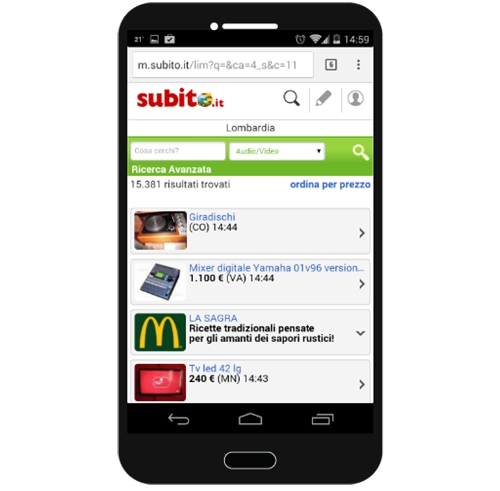 Il formato native advertising per desktop e mobile di Subito.it si presenta graficamente come un normale annuncio della piattaforma, anche se chiaramente sponsorizzato, e viene inserito in terza posizione nella pagina di elenco annunci, in primo scroll (apri la gallery fotografica per visualizzare le immagini).