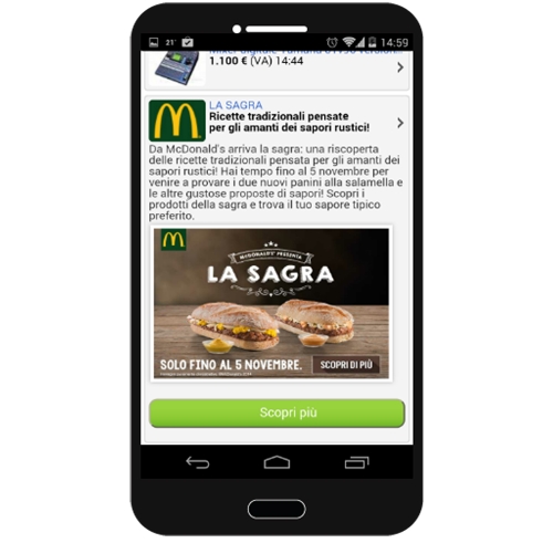 Mc Donald’s è stato tra i primi brand a scegliere il formato native advertising di Subito.it, sia per desktop sia per mobile, per la campagna ‘La Sagra’, che ha portato il gusto tipico delle sagre di paese nei ristoranti del colosso americano.