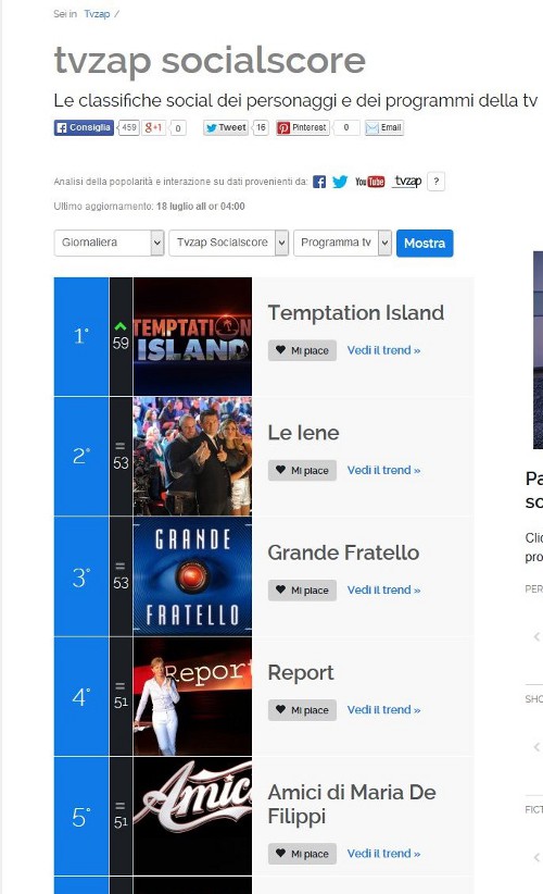 La puntata di ieri, 17 luglio, del programma, dopo il pieno di ascolti su Canale 5 con2.892.000 spettatori con share di 15.45%, ha segnato il record anche sui social network Twitter e Facebook. Il post che ha scatenato i fan: 'Voglio essere tuo marito, mi vuoi sposare?' ha registrato tra commenti, like e condivisioni oltre 52 mila interazion ipiazzandosi al primo posto del socialscore dei programmi più attivi in rete. Grande attività live anche su Twitter dove il numero di tweet con l’hashtag#temptationisland ammonta a oltre 30 mila nelle ultime 24 ore.
