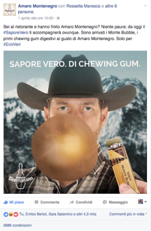 L’esordio è avvenuto il primo aprile su Facebook con un post che ha fatto impazzire i fan della marca. Una divertente extension-line di prodotto che ha visto protagoniste per un giorno le chewing-gum al gusto di Amaro Montenegro, da assaporare rigorosamente dopo i pasti.