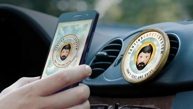 Prendendo ispirazione dai vecchi santini da auto, la Compagnia ha ideato un innovativo device da tenere sul cruscotto dotato di tecnologia NFC che dialoga con il cellulare del guidatore attraverso un’App dedicata, in questo modo disabilita ogni notifica e risponde al suo posto mentre è al volante, evitandogli pericolose distrazioni.