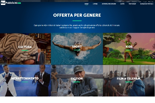 Inoltre nell’ottica di garantire un dialogo diretto e trasparente con investitori e centri media, il sito ospita una sezione dedicata ai listini - sempre aggiornata e arricchita da presentazioni commerciali - e una sezione contatti che consente di rivolgersi direttamente al referente di ciascuna area regionale e/o di ogni iniziativa per richieste particolari . Rai Pubblicità infatti è in grado di studiare soluzioni calibrate sulle specifiche esigenze di ogni investitore e costruite in modo da poter sfruttare sinergicamente ed efficacemente tutte le piattaforme dell’universo Rai. Ogni giorno oltre 42,4 milioni di Italiani scelgono Rai, grazie anche alla più ampia offerta editoriale del mercato suddivisa in cultura, sport, kids, intrattenimento, fiction e film & telefilm . Per ciascun genere vengono dettagliate offerte per canale, tipologia, audience e caratteristiche tecniche.