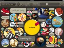 Enizyme Annual Player 2010 (www.enizyme.com/ipad/), è la nuova applicazione gratuita per iPad/iPhone, che riunisce in sé arte, interaction design e navigazione multisensoriale e che racconta il primo anno di Enizyme, gli oltre 150 giovani talenti che, da tutto il mondo e con le più diverse discipline artistiche, interpretano ogni momento della comunicazione di Eni.La prima schermata coinvolge subito l’utente, grazie a una griglia di elementi accompagnata da animazioni ed effetti sonori che rappresenta la cover dell’anno 2010. Il jog dial centrale, ispirato al mondo della musica, scorre automaticamente componendo lo sfondo di opere e artisti che di mese in mese hanno caratterizzato l’attività di Enizyme.