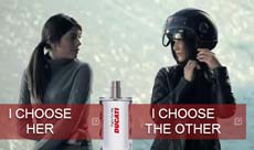 Chi scegliere spetta agli internauti: i ragazzi si stanno misurando tra istinto e razionalità, mentre le ragazze giocano uno dei due ruoli femminili, in un mix di seduzione e sensazioni, anche divertenti. Ognuna delle due dice allo spettatore interattivo: “Fight For Me”, il nome della fragranza Ducati, appunto. Ma solo una è la scelta premiata dal film.Il progetto si sviluppa partendo dalla pagina Facebook (http://www.facebook.com/Ducati.Fight.For.Me),lanciata a ridosso delle scorse festività natalizie con una campagna su varie testate online (Gazzetta.it, Mtv.it, Studenti.it, YouTube e Facebook). Ad oggi siamo prossimi ai 100.000 video visti.