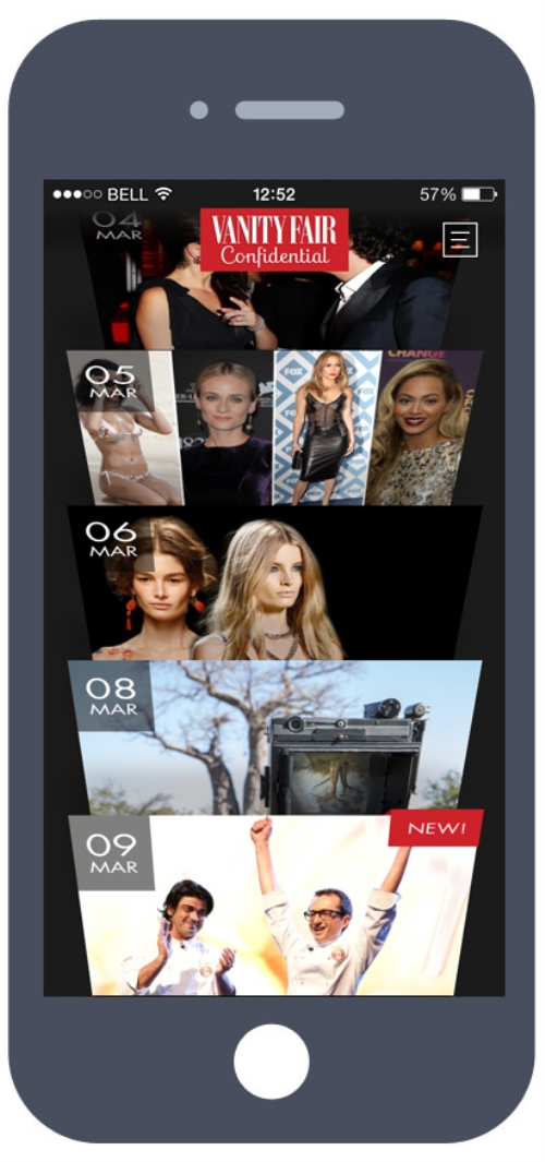 Ogni giorno, con la nuova applicazione, le notizie più fresche, attuali e condivise raggiungeranno gli utenti, conciliando contenuti di qualità e d’intrattenimento con un’esperienza di fruizione completamente nuova. Vanity Fair Confidential è infatti pensata e realizzata per essere utilizzata in movimento, dando la possibilità di essere aggiornati in qualsiasi momento e in qualsiasi luogo - tramite il proprio smartphone - su tutti i contenuti proposti dal brand, dalle celebrities alla moda, dal beauty agli approfondimenti delle grandi firme: ogni giorno uno snack dal mondo Vanity Fair.