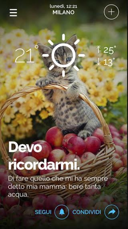 Grafica innovativa, personalizzabile e di facile lettura, con funzionalità per la condivisione sui social, che offre all’utente informazioni in tempo reale sul meteo di oltre 20.000 località in Italia e nel mondo, in modo divertente e creativo. Il design è accattivante, personalizzabile e user-friendly.