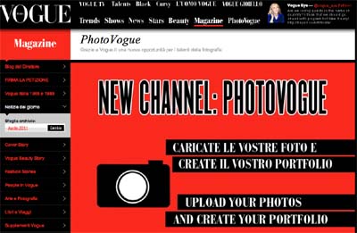Inoltre, in questi giorni Vogue.it inaugura il nuovo canale PhotoVogue, dedicato a tutti gli appassionati di fotografia. Una nuova piattaforma che permette agli utenti di caricare immagini direttamente sul sito: la redazione vaglierà poi le singole foto e le più belle saranno pubblicate in primo piano nella homepage della sezione PhotoVogue. Ma non solo, perché, come premio speciale, i tre migliori scatti di ogni mese saranno pubblicati sulle pagine del mensile Vogue Italia.