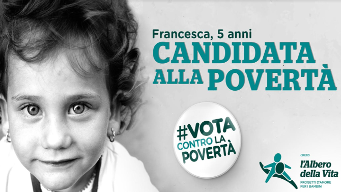 È questa la nuova campagna web, online fino al 4 marzo, rielaborata dall’Ente su un’idea creativa di Innovaire, per dire ancora una volta stop alla povertà minorile in Italia. Un mese di presenza sui social con i propri 'candidati', con uno slogan chiaro e diretto. E per un messaggio così drammaticamente attuale, Fondazione L’Albero della Vita, prende momentaneamente a prestito il linguaggio politico in un momento così importante e decisivo per il nostro Paese: l’intento è quello di portare all’attenzione la situazione emergenziale di molte famiglie in Italia, situazione in continuo peggioramento negli ultimi anni (dal 2015 al 2016 le famiglie con tre o più figli minori in povertà assoluta sono passate dal 18,3% al 26,8%.