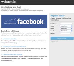 Il prossimo aprile, Webtrends organizzerà un Webinar per illustrare come le aziende possono sfruttare tutti i vantaggi della nuova funzionalità di Webtrends Analytics 9 per la misurazione di Facebook. Per maggiori informazioni e per registrarsi al webinar, clicca qui.