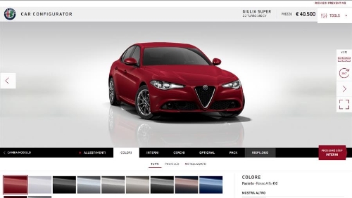 Dopo essere stata svelata anche nelle sue versioni più accessibili in occasione del Salone di Ginevra 2016,l’Alfa Romeo Giulia è finalmente pronta al debutto su strada, ordinabile in cinque diversi allestimenti - Giulia, Super, Quadrifoglio, Business e Business Sport - e sei motorizzazioni. Per il nuovo modello di punta della casa del Biscione, che per contenuti tecnici ed elevate prestazioni non ha pari nel mercato delle berline di medie dimensioni, l’agenzia torinese WEDOO ha sviluppato un configuratore di ultima generazione per offrire ai clienti un’esperienza d’acquisto unica, coniugando estetica e funzionalità (link: carconfigurator.alfaromeo. com/it_IT/Giulia ).