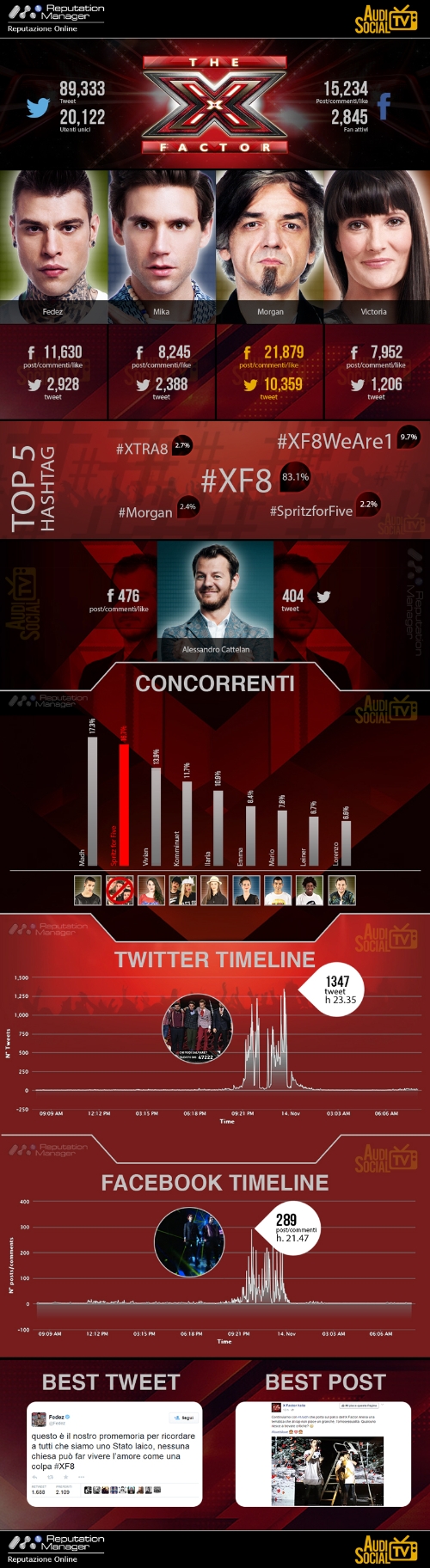 I giudici. Il più twittato è stato Morgan con 10.359 tweet, la sua uscita dallo studio ha naturalmente scatenato molte reazioni e la consueta ironia del pubblico. In quel momento, alle 23.35 si è anche raggiunto il picco di commenti su Twitter: “Morgan lascia #XF8, il titolo Red Bull crolla in Borsa.”, “Dalla regia mi dicono che Morgan prende bene le sconfitte. #XF8”, Ok Morgan, ci vediamo giovedì prossimo. #XF8”.