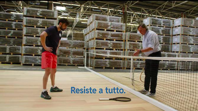 Nel video, Panatta sperimenta su un campo da tennis indoor, allestito in tempo record con Smartwood – che è a incastro e rende la posa facile e rapida - tutte le caratteristiche del pavimento: resiste perfettamente al calpestio del match, rimane intatto nel tempo e resiste a tutti gli urti, anche quelli provocati dalla racchetta lanciata a terra dal giocatore sconfitto.