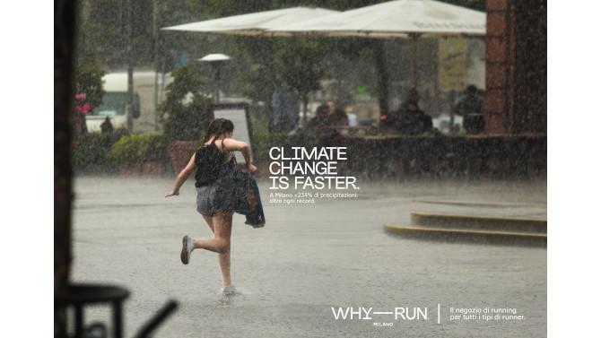 Con il titolo 'Climate Change Is Faster', la campagna sottolinea come le condizioni meteorologiche estreme, ormai quotidiane a Milano, ci costringano tutti a diventare runner improvvisati.