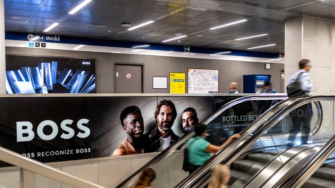 In particolare, nell’ambito della linea M4, è stata pianificata la domination della stazione San Babila. Situata in una delle zone più esclusive di Milano, la fermata rappresenta la location ideale per rafforzare il posizionamento del brand: non solo intercetta un’audience prevalentemente business e alto-spendente, ma è anche in prossimità di un flagship store BOSS. A completare l’esperienza immersiva, è prevista inoltre la personalizzazione di un intero treno, attiva fino al 12 ottobre, che intensificherà il messaggio lungo il percorso dei viaggiatori, dall’Aeroporto di Linate fino a San Cristoforo, nella zona sud-ovest della città.