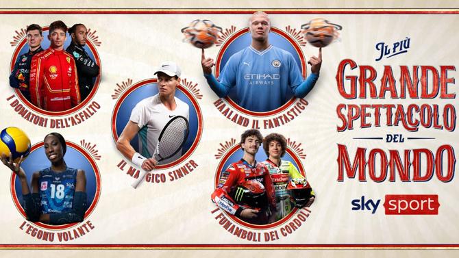 LA NUOVA CAMPAGNA – Guido Meda è tra i protagonisti della campagna “Il più grande spettacolo del mondo!” nelle insolite vesti di presentatore del circo, metafora della Casa dello Sport di Sky. È lui a presentare i numeri delle stelle dello sport che, per l’occasione, vestono i panni di circensi d’eccezione: il primo numero è rappresentato da “il magico Sinner”, protagonista dei prodigi del grande tennis. Spettacolo assicurato con il mangiafuoco Federica Masolin. Gli imprevedibili e spericolati “domatori dell’asfalto”, Charles Leclerc, Carlos Sainz, Lewis Hamilton e Max Verstappen, pronti a sfrecciare per le mirabolanti sfide della F1. Moto tutte da domare quelle di Francesco Bagnaia e Marco Bezzecchi, nei panni dei magici “funamboli dei cordoli”, con il gas a martello per liberare la magia della MotoGP. Ogni circo ha i suoi giganti, come il fachiro Giorgio Chiellini e “Haaland il fantastico”, cannoniere d’eccezione delle notti di calcio europeo. Nasi all’insù per “l’Egonu volante”, con le sue potentissime schiacciate di fuoco. Tutto pronto per il grande show, a cui prenderà parte anche Alessandro Del Piero, in un ruolo mai visto prima.
