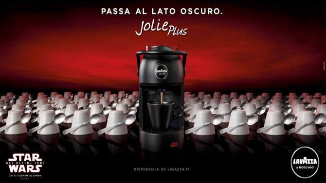 Mentre il 13 dicembre, al cinema, arriva il nuovo episodio Star Wars: Gli ultimi Jedi, gli spettatori in sala si apprestano a passare al 'lato oscuro': quello di Jolie Plus Special Edition, la macchina disponibile solo su Lavazza.it in edizione limitata del sistema espresso A modo Mio, creata da Lavazza per celebrare il nuovo film di una delle saghe cinematografiche più amate di tutti i tempi.