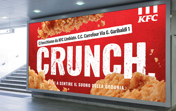 La nuova collaborazione si avvia con due campagne. Una corporate, dedicata alle attività di prossimità, con l’obiettivo di consolidare l’awareness del brand e dei suoi valori soprattutto attraverso i ristoranti. La scelta creativa è tagliata su misura per il pollo unico del Colonnello Sanders e per il target dei giovani, di cui mutua il linguaggio e lo slang. Sbam / Crunch / Wow: attraverso l’uso di onomatopee, la campagna celebra infatti il gusto del pollo fritto di KFC e le sensazioni che letteralmente si provano all’assaggio.