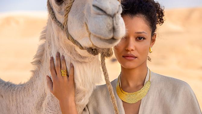 Tutto prende vita nel deserto. Una donna avanza a piedi scalzi nella sabbia, invitandoci a percepire la morbidezza del terreno a contatto con la pelle nuda. I gioielli, resi unici dalle forme artigianali e dalla lavorazione handmade, accompagnano la protagonista nei suoi momenti di esplorazione iniziando dalla nuance dorata dell’ottone, luminosa e piena di energia. Le forme e i dettagli dei gioielli raccontano infatti la passione per il viaggio, cuore pulsante della filosofia del brand italiano.