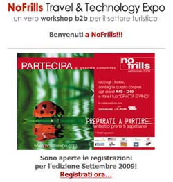 Il 25 e 26 settembre Bergamo diventa la Capitale del Turismo italiano: grazie a NoFrills, una delle principali fiere del turismo professionale giunta alla sua nona edizione, il padiglione fieristico del capoluogo lombardo riunirà i nomi più importanti del tour operating, del mice e dell’incoming."La manifestazione sta acquisendo sempre più importanza e sta diventando un vero punto di riferimento a livello nazionale - afferma Bertagni, Amministratore NoFrills - Diamo il via alla stagione fieristica del settore e ospitiamo le aziende più importanti". Una particolare attenzione va dedicata all’attività convegnistica di NoFrills.