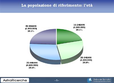 L'indagine, realizzata nel mese di luglio, è basata su 805 interviste somministrate a un campione rappresentativo degli italiani 15-55enni regolari utilizzatori di internet, pari a un universo di 16.2 milioni di adulti, corrispondenti al 49.2% della popolazione totale in quella fascia d’età. Come spiegato da Finzi, i risultati dell’indagine cancellano una serie di luoghi comuni che, da sempre, accompagnano lo sviluppo di internet. Innanzitutto, le variabili ‘genere’ ed ‘età’ non sembrano più granchè rilevanti per classificare gli internauti regolari italiani. Con questo si vuole dire che le donne hanno quasi annullato il gap che le penalizzava sino a qualche tempo fa, raggiungendo il 47% del totale contro il 53% dei maschi; e che internet non è più un fenomeno solo o prevalentemente giovanile. Per la precisione il 20% ha tra i 15 e i 24 anni, il 27% tra i 25 e i 34 anni, il 29% è 35-44enne e il 24% è 45-55enne (vedi grafico 1). Facendo i calcoli si ricava che i 35-55enni con il loro 53% battono i 15-34enni fermi al 47%.