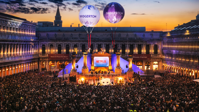 In occasione del debutto della prima parte della quarta stagione di Bridgerton, Piazza San Marco si è trasformata in un grande palcoscenico a cielo aperto per un evento speciale realizzato da Netflix per l'apertura del celebre Carnevale di Venezia.
