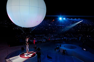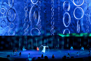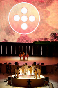 Completamente vestiti di bianco, grazie a un poncho contenuto in un audience kit, hanno partecipato alla cerimonia interagendo da subito grazie a sms, specchietti, palloncini e una coreografia di massa diretta da Nikos Lagousakos.