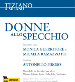 Il secondo Incontro 'Donne allo Specchio' si terrà mercoledì 15 dicembre alle ore 18.00 a Milano presso il Palazzo Reale nella Sala delle Conferenze, a margine della mostra organizzata da Eni con Museo del Louvre 'Tiziano. Donna allo Specchio', allestita a Milano, Palazzo Marino, Sala Alessi, fino al prossimo 6 gennaio. Antonello Piroso dialogherà con Monica Guerritore e Micaela Ramazzotti prendendo spunto da alcuni dei temi ancora attuali del capolavoro-icona del femminile nell’arte. Dopo l’incontro con Miriam Mafai e Giulia Carcasi intorno alla scrittura e alla condizione femminile, sarà la volta del cinema e del teatro. La conversazione prenderà avvio dal simbolo dello specchio, inteso come invito all’introspezione, per intrecciare, quindi, rimandi al quadro e spunti di cronaca da commentare. Le domande del giornalista stimoleranno chiavi di interpretazione dell’essere donna nel gioco tra passato e presente: la dama di Tiziano e le contemporanee Monica Guerritore e Micaela Ramazzotti.