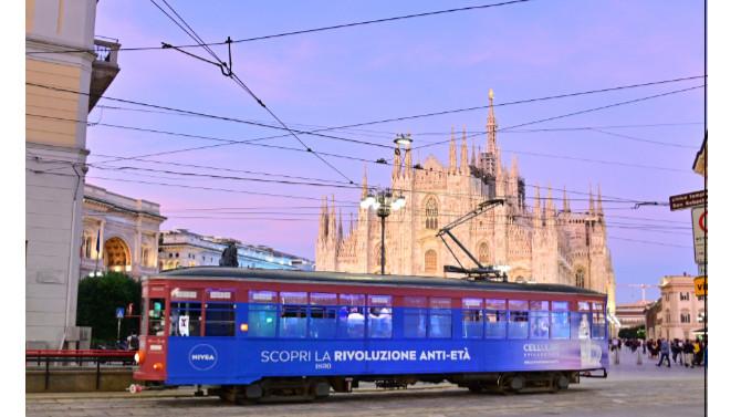 Il beauty tram, decorato dentro e fuori nei toni iconici del blu NIVEA, ha attraversato il cuore di Milano con partenza da Piazza Fontana, dove una pensilina brandizzata accoglieva i passeggeri sotto un suggestivo allestimento scenografico.