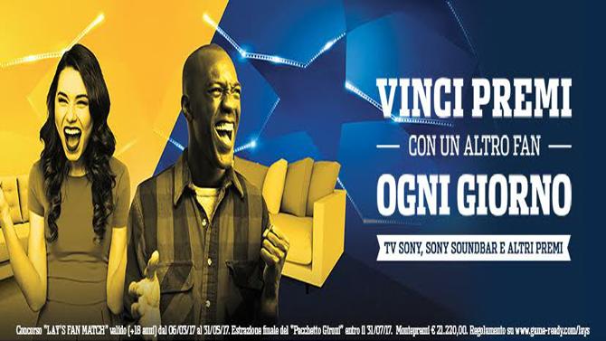 Scopri subito se hai vinto uno dei fantastici premi: acquista un pacchetto di patatine Lay’s - Classiche (145gr), Ricetta Campagnola (133gr), Bacon (133gr) e Paprika Dolce (133gr) - riportanti le strip promozionali, accedi al sito www.game-ready.com/Lays e inserisci il codice univoco riportato all’interno della confezione. In palio ogni giorno fantastici premi tra cui: poltrone gonfiabili, Tv Sony e Sony Soundbar. Inoltre, tutti i codici pervenuti sul sito web nel periodo del concorso (dal 6/03/2017 al 31/05/2017), parteciperanno all’estrazione finale di un biglietto per due persone per le partite della fase a gironi della stagione 2017-18 della UEFA Champions League.