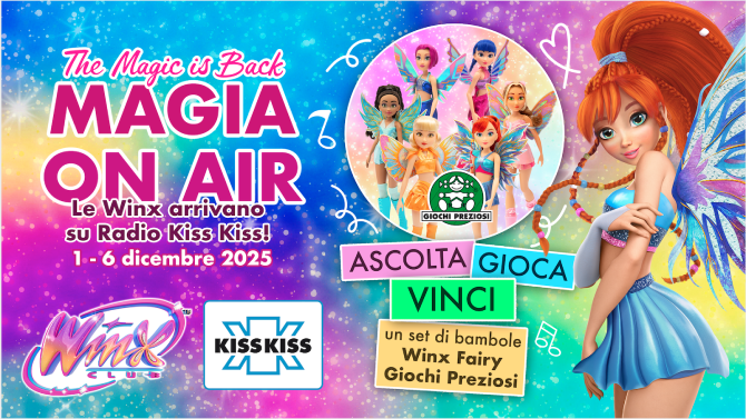 Per sei giorni, Radio Kiss Kiss celebrerà una protagonista diversa del celebre cartone animato italiano Winx Club: Bloom, Stella, Flora, Musa, Tecna e Aisha. Ogni fata sarà al centro di una call to action speciale, legata alla sua caratteristica distintiva: il coraggio, la luce, la gentilezza, la creatività, l’ingegno, la forza.
