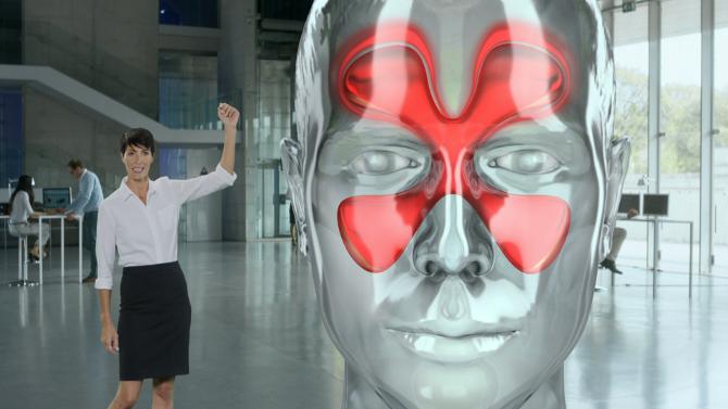 La campagna firmata da Armando Testa riprende il format Laboratorio con l’ormai nota Presenter e le gigantesche teste di cristallo. Grazie alla trasparenza del cristallo, vediamo all’interno della testa le cavità nasali con la loro tipica forma a X che si colorano gradualmente di rosso dalla base fino alla fronte per testimoniare l’infiammazione e il conseguente dolore.