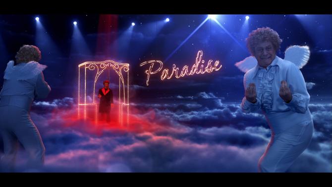 Voulez vous café avec moi ce soir? - canta il Crozza-Diavolo tentatore, salito dagli inferi in Paradiso per godersi il caffè più buono del mondo (e del cielo). Tra ascensori luminescenti, coni di luce, bastoni alla Fred Astaire e giacche scintillanti, il Paradiso si tinge di rosso e di blu, e anche Crozza-San Pietro, chiamato a difendere il territorio, troverà per l’occasione un’inedita voce alla “Elvis”.