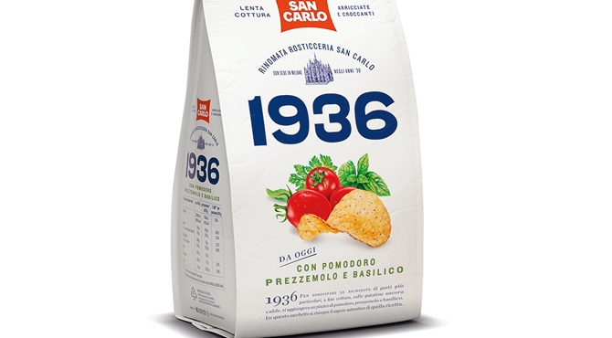 Una firma prestigiosa per un prodotto speciale, che accoglie nella sua gamma la nuova 1936 con pezzetti di pomodoro, prezzemolo e basilico. Una delle tradizioni della rosticceria San Carlo, quando le patatine ancora calde, venivano arricchite con pezzetti di pomodoro, prezzemolo e basilico per una nuova esperienza di gusto.