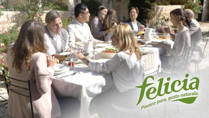 Lo spot svela passo dopo passo la ricetta della felicità a base di pasta Felicia, realizzata miscelando sapientemente gli ingredienti fondamentali che ci consentono di vivere bene: energia, allegria, passione, sorrisi, natura e benessere quanto basta. Il filmato si sviluppa attraverso immagini fortemente emozionali che riprendono frammenti di vita quotidiana, riprese caratterizzate da close up e dettagli che illustrano le fasi della ricetta narrate da un voice over caldo e rassicurante in un gioco che magicamente prende vita tra le varie fasi della preparazione. Il messaggio finale è che la felicità è nel sorriso di chi sa apprezzare la ricetta perfetta, un momento di intenso piacere e convivialità.