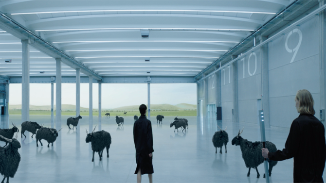 Icona, storia e futuro. Il Nylon Prada, tessuto cult della maison, torna protagonista nel 2018 con una nuova collezione e un cortometraggio che ne racconta la produzione in un mondo immaginifico e una storia ambientata in un futuro non definito. Benvenuti nella Nylon Farm. In uno scenario futuristico, bracci robotici tosano speciali pecore nere dalla natura misteriosa, metà animale, metà sintetica. Il loro vello, fatto di nylon grezzo, viene tosato e tessuto meticolosamente da telai ipertecnologici che ne rendono la trama setosa e preziosa.