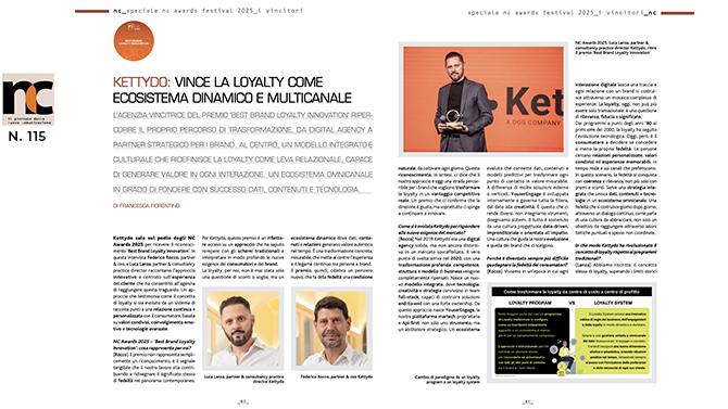 Kettydo sale sul podio degli NC Awards 2025 per ricevere il riconoscimento ‘Best Brand Loyalty Innovation’. In questa intervista Federico Rocco, partner & ceo, e Luca Lanza, partner & consultancy practice director raccontano l’approccio innovativo e centrato sull’esperienza del cliente che ha consentito all’agenzia di raggiungere questo traguardo. Un approccio che testimonia come il concetto di loyalty si sia evoluto da un sistema di raccolta punti a una relazione continua e personalizzata con il consumatore, basata su valori condivisi, coinvolgimento emotivo e tecnologie avanzate.
